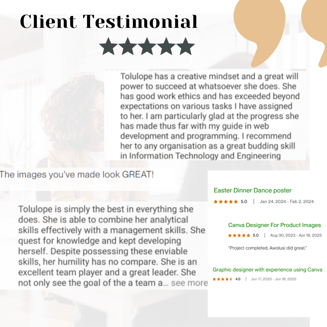 I’m Tolulope Awolusi is the founder of Graceful Design and works as a creative designer in digital design and digital marketing. Noteworthy projects include designing eye-catching social media graphics and product images using Canva, Photoshop, Photopea, Blender, Clo3d, Capcut and Da vinci and creating promotional posters for events with quick turnaround requirements. Skilled in strategic brand design, UI/UX, and producing attention-grabbing marketing materials, ensuring visuals captivate and engage target audiences. Core competencies in Adobe Creative Suite and Canva, applied to enhance user experiences and elevate brand storytelling across diverse projects.